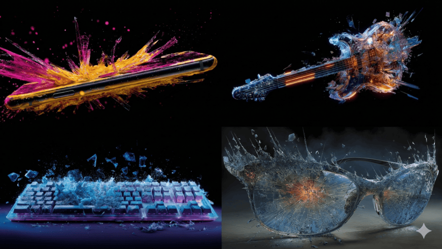 High-speed photography of [PRODUCT] in the exact microsecond of exploding mid-air. The main body of the [PRODUCT] is actively fracturing and bursting outward from the center. [COLOR/S] hitting the [PRODUCT] and shards, pitch-black background, frozen motion, highly detailed, modern artistic feel.Model: Nano Banana 2
