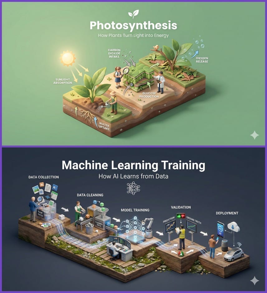 Create a clear, 45° top-down isometric miniature 3D educational diorama explaining [PROCESS / CONCEPT].