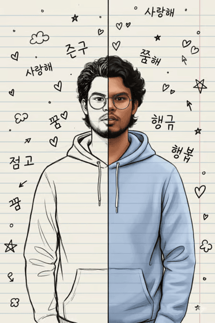 Half-realistic photograph, half detailed black-and-white doodle sketch of a young man (use the uploaded photo as the reference) with curly hair and glasses, wearing a light blue hoodie. The background is lined school notebook paper covered in simple black-and-white doodles, hearts, stars, and handwritten Korean Hangul text [Your Text]. Perfect center split, digital art, high detail.Model: Nano Banana Pro