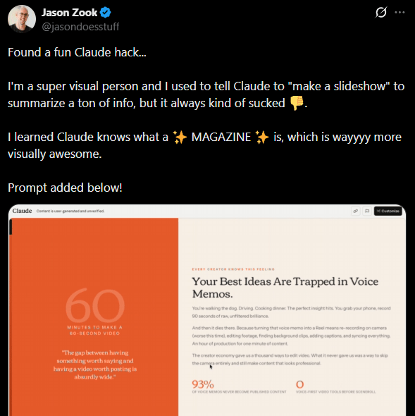 This prompt turns your product copy into a bold, single-file horizontal magazine built in HTML (not a slideshow), producing full-bleed, full-viewport pages that feel more visual and polished than stacked slides. It creates 10 pages — Cover, Problem, Solution, Features, Audience, Competition, Origin Story, Launch/Traction, Tech, and Back Cover — each with 100vw × 100vh layouts.