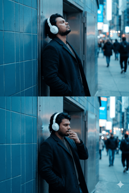 Cinematic portrait sequence of an Asian man [uploaded image as ref] leaning against a tiled urban wall near a doorway, captured in a quiet, introspective moment. He wears large white over-ear headphones, immersed in music, his posture relaxed against the wall. In one frame, he tilts his head slightly back with his eyes closed, as if deeply feeling the music. In another, he raises his hand gently near his lips, lost in thought. His dark hair falls naturally, slightly tousled, adding to the effortless mood. He wears a dark coat over a casual outfit, blending into the muted urban environment. The setting features clean tiled walls, a door, and subtle architectural details, creating a minimalist city backdrop. The color grading leans toward cool blue and teal tones, evoking a calm, melancholic atmosphere. Soft natural light creates gentle highlights and smooth shadows without harsh contrast. The image carries a strong analog film aesthetic with visible grain, slight blur, and soft haze. Dreamy elements include light diffusion, subtle glow, and faint mist-like softness that softens edges and enhances emotional depth. Imperfect framing, quiet composition, and cinematic stillness create the feeling of a fleeting personal moment. Cinematic film still, dreamy and introspective mood, urban solitude, soft emotional atmosphere, soft haze, glow effect, light bloom, film grain, slight motion softness, atmospheric blur.Model: Nano Banana 2