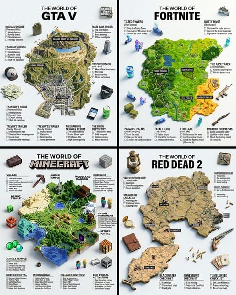 A hyper-realistic 3D game guide infographic poster for [GAME]. The in-game world of [GAME] is rendered as a raised, textured terrain map floating on a clean light gray surface — the map shape and landscape must reflect the actual geography and visual aesthetic of [GAME] (urban, western, fantasy, island etc). Iconic in-game locations from [GAME] are placed as miniature 3D sculpted models at their correct in-game positions across the map — each one highly detailed, photorealistic and instantly recognizable to fans. Roads or paths connect key locations as white lines across the terrain. Around the map, floating 3D decorative props and items iconic to [GAME] are scattered on the light gray surface. The official logo of [GAME] is shown as a small detailed object in the upper right corner. Each major location has a bold black label on the map, and beside the map, each location has a neat checklist of its most iconic moments or activities associated with that place, in clean sans-serif typography. A large bold title at the top reads: “THE WORLD OF GAME” in black uppercase typography with [GAME] in heavy bold. The overall aesthetic is premium editorial — soft studio lighting, photorealistic 3D render, white/light gray background, clean layout, 4:5 aspect ratioModel: Nano Banana 2