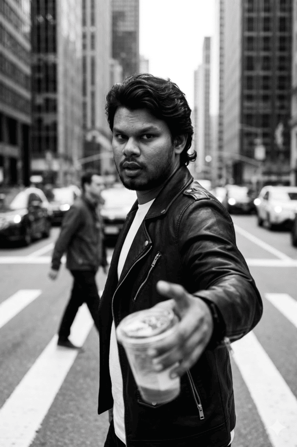 Shot on a high-detail Hasselblad X2D 100C with a fast 80 mm lens, delivering cinematic depth of field and professional quality: a dynamic medium close-up captured from a slightly low angle, emphasizing the model's forward movement while keeping the face and shoulder in sharp focus, with the outstretched hand deliberately blurred in the foreground. This is an editorial street-style photograph capturing a moment of spontaneous urban connection. The male model a reference image walks across a busy city crosswalk, sharply turning his head over his shoulder to look directly at the viewer while extending one hand forward in a gesture of invitation or urging someone to follow. He wears a classic black leather biker jacket over a crisp white T-shirt, embodying effortless metropolitan chic. In his extended hand he holds a clear plastic cup with a drink, adding a sense of motion blur and immediate interaction with the viewer. The scene unfolds on a lively downtown street during the daytime, defined by tall skyscrapers and urban traffic softly blurred in the background. The image uses a high-contrast black-and-white tonality, relying on bright natural daylight al daylight and sharp shadows to achieve a gritty, authentic street atmosphere. The overall aesthetic is raw, documentary-style fashion photography inspired by 1990s street culture and contemporary menswear campaigns.Model: Nano Banana 2