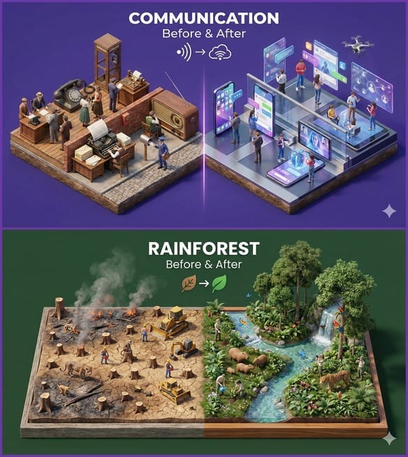 Create a clear, 45° top-down isometric miniature 3D split diorama showing [SUBJECT] before and after [TRANSFORMATION].