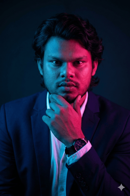 They are wearing a dark top and a watch. The background remains dark and minimal, emphasizing the colorful illumination on the face and upper body. Cinematic, sharp, and highly detailed.Model: Nano Banana 2