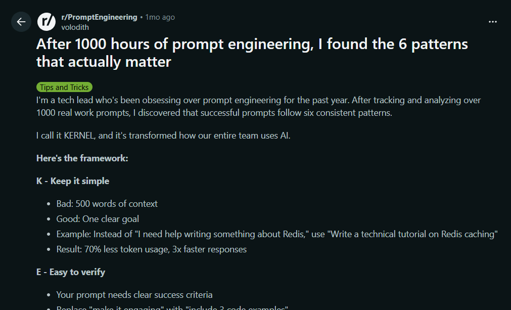 This prompt guide distills a year of real production use and 1000 tracked prompts into KERNEL, a six-part method for building prompts that consistently deliver. Youāll learn how to keep requests simple, define verifiable success criteria, make results reproducible, narrow each prompt to a single goal, add explicit constraints to prevent drift, and use a logical structure that separates context, task, constraints, format, and verification.