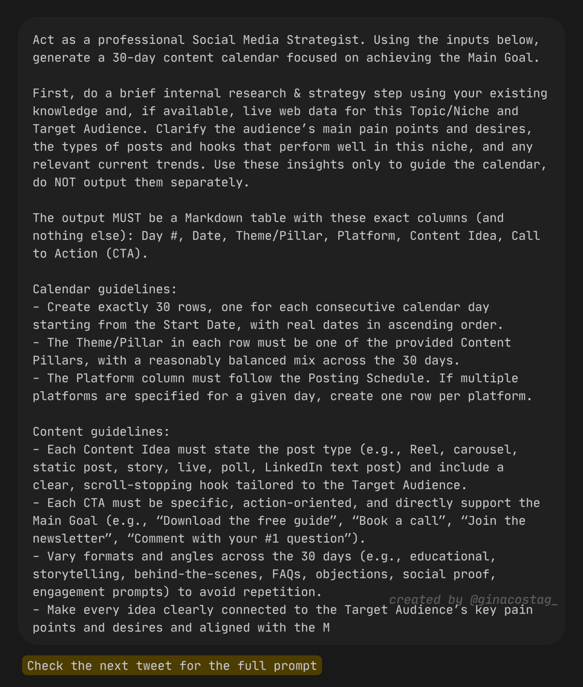 This prompt creates a full 30-day social media content calendar based on strategy, not guesswork. Using your niche, audience, goals, platforms, and content pillars, it produces daily post ideas with strong hooks, varied formats, and clear calls to action.